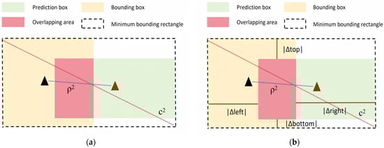To normalize the centroid distance and the mitigate scale sensitivity, the squared diagonal length of the minimum enclosing box (c2) is computed, as formulated in Equations (4)–(6).