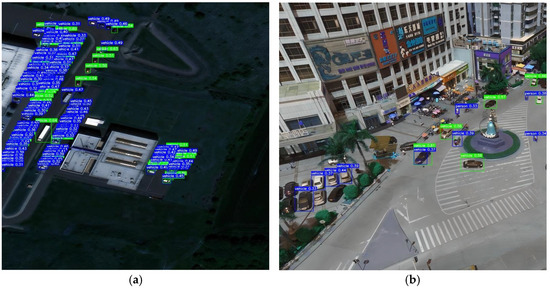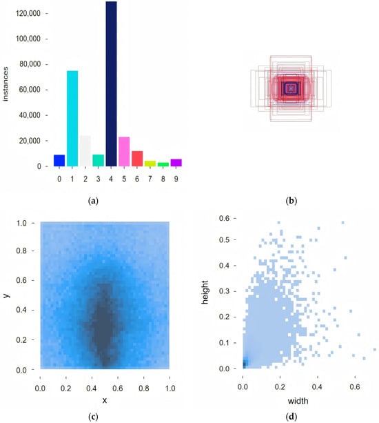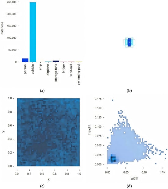 The VisDrone2019 dataset represents a seminal open benchmark in UAV remote sensing, jointly established in 2019 by Tianjin University’s Machine Learning and Data Mining Laboratory and multiple research institutions [51]. Constructed through multi-platform UAV deployments across distinct geographical regions (including urban, suburban, and rural environments), this dataset comprehensively captures complex environmental characteristics under authentic remote sensing scenarios. It contains 8629 high-resolution static images (ranging from 960 × 540 to 4000 × 3000 pixels), partitioned into training (6471 images), validation (548 images), and test (1610 images) subsets. All the data underwent rigorous geospatial registration and radiometric calibration. Figure 7 presents the statistical profile of the training set.