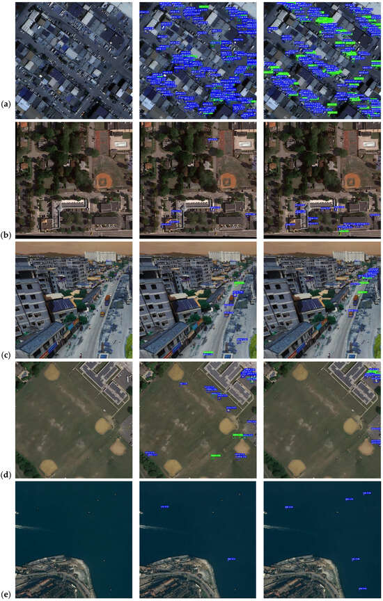Visual detection results of AI-TOD datasets. (a) a dim and complex scene; (b) a scene with numerous obstacles; (c) a road scenario; (d) an open area scene; (e) a maritime scene.