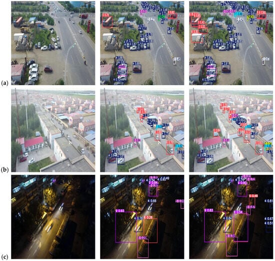 Visual detection results of VisDrone datasets. (a) Daytime close-range scenarios; (b) Daytime long-distance scenario; (c) Nighttime occlusion scenario.