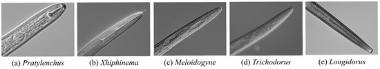 - Thevenoux, R.; Le, V.L.; Villessèche, H.; Buisson, A.; Beurton-Aimar, M.; Grenier, E.; Folcher, L.; Parisey, N. Image based species identification of Globodera quarantine nematodes using computer vision and deep learning. Comput. Electron. Agric. 2021, 186, 106058. [Google Scholar] [CrossRef]