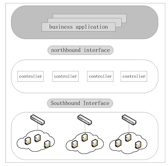 7]. The application layer is at the top of the architecture and is composed of customized applications developed by developers using the APIs provided by the control layer. It communicates with the control layer through the northbound interface. The control layer, as the core of the architecture, consists of multiple controllers and their functional modules. It receives instructions from the application layer through the northbound interface, sends configuration commands to the data layer through the southbound interface, and regularly collects device information from the data layer to achieve centralized network management and control [