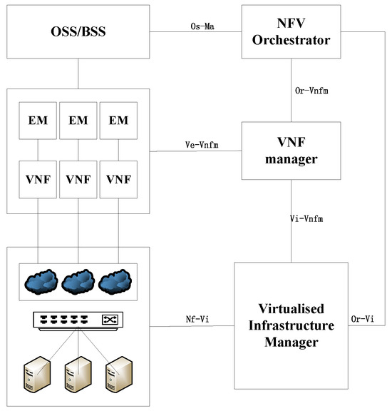 17]. The NFVI provides the underlying virtualized computing, storage, and networking environment for VNFs. VNFs are the software implementations of network functions (e.g., virtual firewalls and virtual load balancers) running on the NFVI. The MANO framework manages and orchestrates the entire NFV environment and includes three functional blocks: Virtual Infrastructure Manager (VIM), VNF Manager (VNFM), and NFV Orchestrator (NFVO). Together, they enable the automated deployment, scaling, and lifecycle management of VNFs, enhancing operational efficiency and network agility [