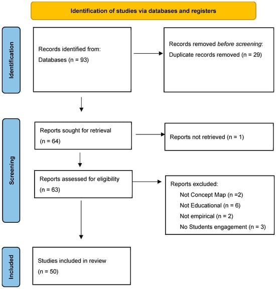 Concept maps and mind maps are visual knowledge representation tools that are widely employed in STEM education. Although concept maps typically emphasize hierarchical or network relationships, and mind maps generally focus on radial structures for idea generation, these terms are sometimes used interchangeably or without clear differentiation in educational research [1,2,19,20]. Therefore, when synthesizing the findings from various studies, we took into account this variability in terminology and approach. For the purposes of this review, we adopted an inclusive approach and considered both types under the broader category of graphical knowledge mapping tools.