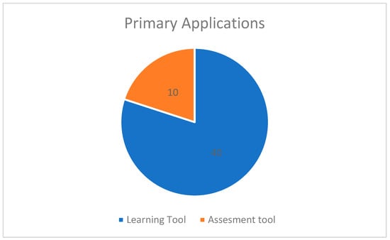 A key objective of this review was to determine whether mind maps are predominantly utilized as learning tools or assessment instruments in STEM education. The analysis of the selected studies revealed that mind maps are primarily employed as learning tools (n = 40), whereas a smaller subset (n = 10) focused on their use as assessment instruments (Figure 2). Representative examples include Menouer et al. [6], Veiga et al. [29], and Petrun Sayers et al. [18] for learning tools, and Evans and Jeong [12] and Foley et al. [30] for assessment tools.