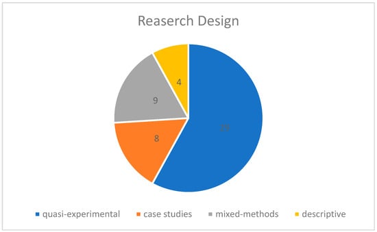 The widespread use of quasi-experimental and mixed-methods approaches highlights a growing trend toward evidence-based evaluations of mind maps’ effectiveness in STEM education (Figure 3). The full distribution of the studies by research design is provided in Appendix A, Table A1.