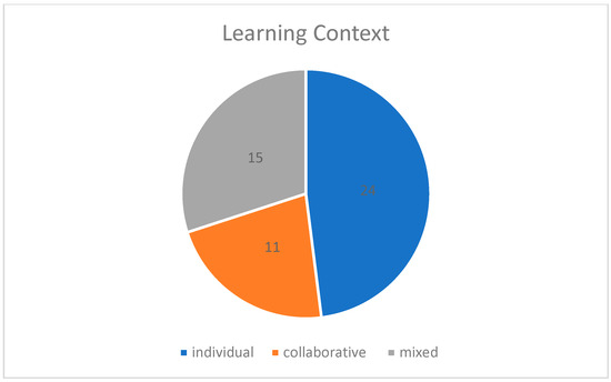 The implementation of mind maps in STEM education varies between individual and collaborative learning contexts. Mind maps are most commonly used in individual learning settings (n = 24), as seen in the studies by Menouer et al. [6], Debbag et al. [22], and Jeong and Evans [10], where students independently constructed mind maps to organize knowledge and for improved understanding. Collaborative applications (n = 11) were employed in studies such as those by Krab-Hüsken et al. [9] and Fung and Liang [35], highlighting the group co-construction of maps to foster peer interaction and problem-solving. A mixed approach (n = 15), combining both individual and group activities, was found in the studies by Hwang et al. [16] and Susithra et al. [11], where students began mapping individually and later collaborated to refine their ideas. Overall, while individual use remains the dominant approach, the increasing application of collaborative and mixed methods suggests a shift toward more interactive and socially engaged learning experiences in STEM education (Figure 4). The complete list of studies by learning context is presented in Appendix A, Table A1.