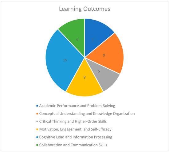 Figure 6 visually represents the key outcomes identified across the studies, providing a clearer understanding of how mind maps influence different aspects of student performance and skills in STEM education. In order to provide transparency regarding the distribution of studies across the six outcome categories presented in Figure 7, Table 1 below lists the specific articles associated with each category.
