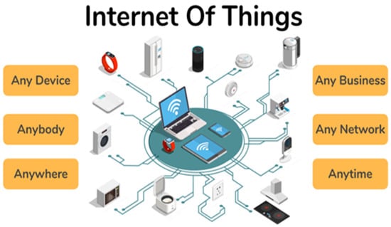 Wireless communication systems play a crucial role in the IoT by enabling seamless data exchange between interconnected devices, business and networks as shown in Figure 1. These systems eliminate the need for physical wiring, allowing IoT devices such as sensors, smart appliances, and industrial machines to transmit data efficiently over short and long distances. Wireless communication in IoT relies on various technologies, including Wi-Fi, Bluetooth, and cellular networks like 4G and 5G. These technologies ensure IoT devices can function in different environments, from smart homes and industrial automation to healthcare monitoring and smart city infrastructure. A well-structured wireless IoT communication system consists of key components, including edge devices, gateways, cloud platforms, and secure communication protocols. IoT devices collect and transmit data wirelessly to gateways, which act as intermediaries by processing and forwarding the data to cloud servers or edge computing units for real-time analysis. Additionally, security mechanisms like encryption, authentication, and blockchain-based verification safeguard data from cyber threats. These elements collectively enhance the efficiency, scalability, and security of IoT applications, making wireless communication a key enabler of IoT-driven innovations [,].