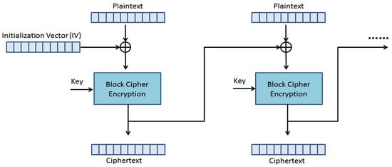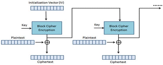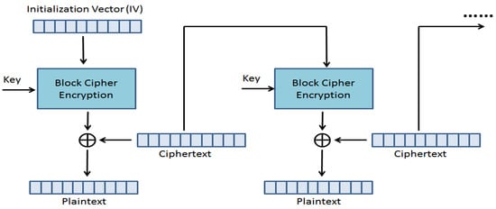 The CBC mode is a block cipher technique that encrypts each block or individual unit of input data using a cipher key. A cipher block chaining uses an Initial Vector (IV) of a specific key length. A chaining key technique that relies on every previous cipher-text block is used to decrypt a block cipher of the ciphertext [,,,]. In Figure 4, the CBC process is displayed.