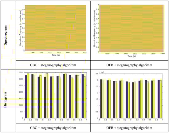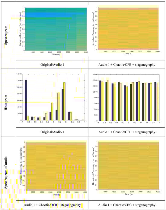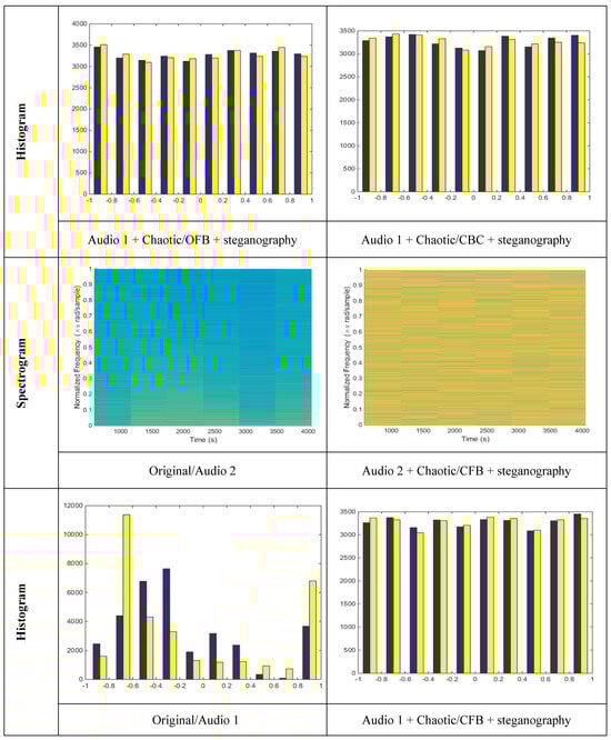 The effectiveness of the proposed crypto-steganography algorithm is evaluated in Figure 9 using a comparative analysis that includes both spectrogram and histogram visualization techniques. A simulation study was conducted on two distinct datasets, each consisting of nine audio samples, as illustrated in Figure 9. For each audio signal, steganographic and chaotic map keys were utilized as IVs. The spectrogram analysis provides a time-frequency representation of the audio signals, allowing for detailed observation of how encryption alters their spectral content. In the spectrogram of the original audio, clear and continuous frequency components are visible, reflecting the structured nature of unencrypted audio. In contrast, the spectrograms of encrypted signals, particularly those processed using the hybrid crypto-steganography method, exhibit significant spectral distortion or complete destruction of frequency information. This indicates that the proposed algorithm effectively disrupts the original signal’s spectral features, thereby enhancing security and making unauthorized interpretation virtually impossible. Complementing the spectrogram analysis, the histogram evaluation illustrates the distribution of intensity levels in the audio signals. The original audio histograms display distinct, non-uniform patterns indicative of natural audio structure. However, the encrypted audio histograms, especially those produced by the proposed hybrid method, show near-uniform distributions. This flattening effect demonstrates the algorithm’s ability to eliminate detectable patterns and increase randomness. Together, the spectrogram and histogram results confirm the robustness of the proposed crypto-steganography framework in concealing both the time-frequency and amplitude characteristics of the audio, ensuring high-quality encryption and secure transmission.