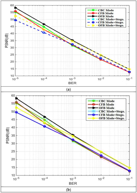 Figure 10 illustrates how sensitive chaotic encryption with various modes of operation is to the BER. Compared to the other modes, the chaotic-OFB mode is more resilient to noise, while at large value of BER OFB Mode + steganography is the best.