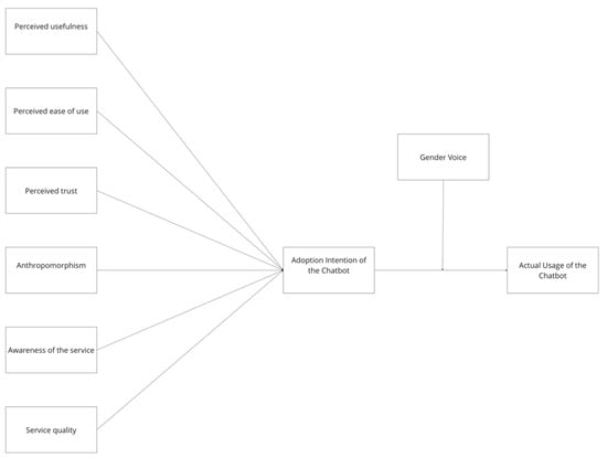 To summarize, H1 is confirmed, meaning that perceived usefulness affects the adoption intention of chatbots for banking, agreeing with [7,14,16,18] and contradicting [11]. H2 is not confirmed, meaning that perceived ease of use does not affect the adoption intention of chatbots for banking, agreeing with [11] and contradicting [14,16,18]. H3 is not confirmed, meaning that perceived trust does not affect the adoption intention of chatbots for banking, agreeing with [7] and contradicting [18,51]. H4 is not confirmed, meaning that anthropomorphism does not affect the adoption intention of chatbots for banking, which contradicts [18]. H5 is not confirmed, meaning that the awareness of the service does not affect the adoption intention of chatbots for banking. H6 is not confirmed, meaning that service quality does not affect the adoption intention of chatbots for banking. H7 is not confirmed, meaning that a gendered voice does not moderate the relationship between the adoption intention and the actual usage of the chatbot for banking. Finally, H8 is confirmed, meaning that the adoption intention affects the actual usage of the chatbot for banking, agreeing with [3,7,17].