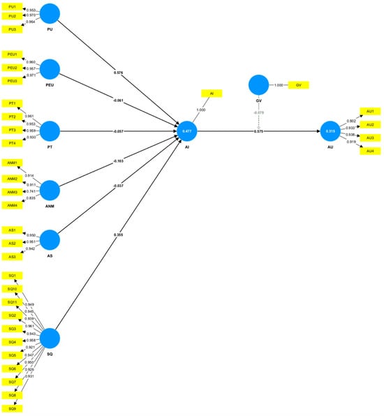 Firstly, we estimated the relationships between the constructs and their indicators. Table 10 displays the convergent validity, the internal consistency reliability, and the discriminant validity. All of the outer loadings of the reflective constructs are well above the threshold value of 0.708, which suggests sufficient levels of the reliability indicator [44]. The indicator ANM3 has the most negligible indicator reliability with a value of 0.549 (0.741)2, whereas ADI and GV had the highest indicator reliabilities with a value of 1 (1)2 as these constructs are unidimensional. All the AVE values are also above the required minimum of 0.50, meaning that the seven reflective constructs have high levels of convergent validity [44]. As the ρA from all the constructs is above the threshold value of 0.70, all of them have a high level of internal consistency reliability [44]. The Cronbach’s alpha and the ρc values for the constructs all exceed the threshold value of 0.70, meaning all the constructs analyzed have a high level of consistency and reliability [44].