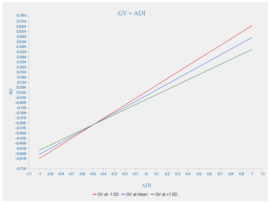 To conduct the moderation analysis of the GV in relation to ADI and AU, we first checked the size of the moderating effect. Figure 2 tests whether GV moderates (i.e., changes the strength or direction of) the relationship between ADI and AU. In other words, it examines whether the type or prominence of the chatbot’s gendered voice influences how likely people are to actually use the assistant once they intend to adopt it.