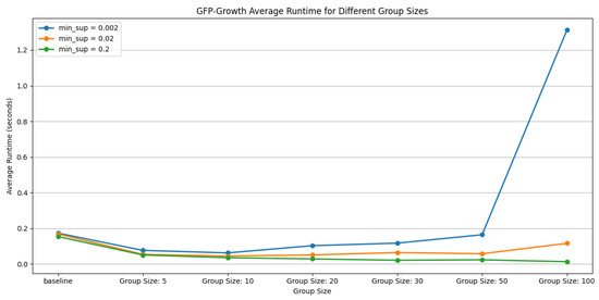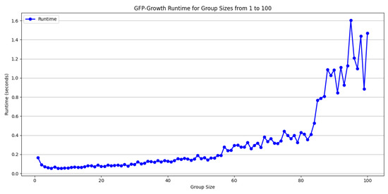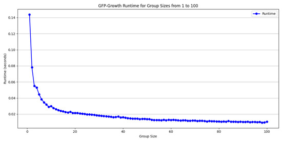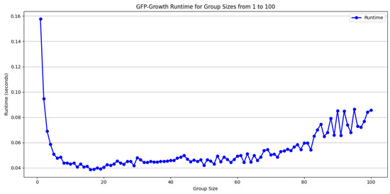 Selecting an appropriate group size is crucial for maintaining the computational efficiency and stability of the GFP-Growth algorithm. Larger groups significantly expand the search space, leading to increased runtime and volatility in the results, whereas smaller groups generally reduce computational overhead but may limit the algorithm’s ability to capture all relevant patterns. In addition to group size, the choice of support and confidence thresholds also significantly affects both the quality and the quantity of rules generated. In Table 1 and Table 2, it is indicated that a higher support threshold produces a smaller but more representative set of frequent itemsets, facilitating faster calculations and more reliable patterns. Conversely, Figure 5 displays that lower support thresholds can uncover additional frequent itemsets, but risk introducing noise or irrelevant patterns. Combining a high support threshold with a high confidence level yields fewer rules that occur frequently and reliably, reducing the computational burden. However, high support with low confidence may indicate weak correlations between items. Meanwhile, low support with high confidence often requires more extensive computation because the algorithm must process larger itemsets. Finally, low support combined with low confidence produces a voluminous set of rules, many of which may lack practical value. Carefully balancing group size, support, and confidence thresholds is therefore essential to optimize runtime while maintaining the interpretability and practical utility of the discovered patterns.