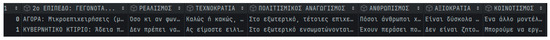 E-polis represents an innovative approach to conducting sociological surveys, taking the form of a digital game designed to engage participants in navigating a virtual city [1]. The game’s structure involves completing a predetermined set of quests, which serve as pathways to advance to higher levels or conclude the gaming experience. These quests are meticulously crafted by political scientists and public administration officers affiliated with the National and Kapodistrian University of Athens (NKUA) [1]. The scenarios and questions presented in the game cover a broad spectrum of political profiles, spanning from the right to the left wing. In Figure 1 and Figure 2, we illustrate the actual gameplay of the first level of our game:
