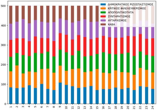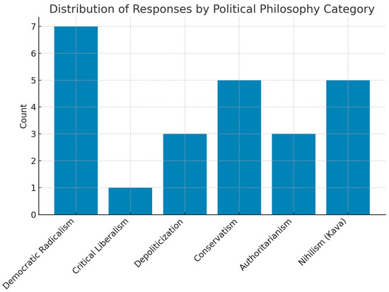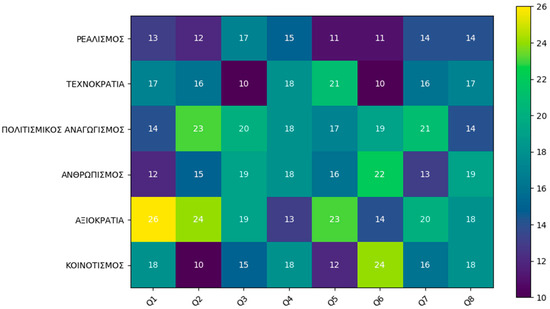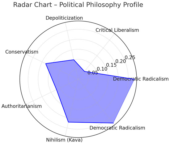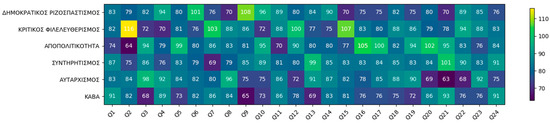 As such, the polar spider plots (Figure 10 and Figure 11) that were presented assist in our understanding by spatially distributing the same categorical data around a central axis, allowing for an intuitive comparison of our six study political profiles. The resulting plot geometry—whether balanced, skewed, or spiked—offers a visual fingerprint of the political mindset we situate in this manuscript. Similarly, stacked bar charts and heatmaps (Figure 12, Figure 13, Figure 14 and Figure 15) showcase aggregated responses, not as individual item-level response distributions, but to suggest actual population-level tendencies. For example, a dominant presence of certain colors across different questions indicates a recurring ideological leaning or cognitive bias embedded in the population or a preset dataset.
