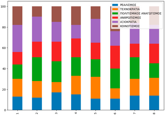 As such, the data visualization and dimensionality reduction presented in Figure 8, Figure 9, Figure 10, Figure 11, Figure 12, Figure 13, Figure 14, Figure 15, Figure 16, Figure 17, Figure 18, Figure 19 and Figure 20 offer some preliminary but meaningful insight into player behavior throughout the game and, most importantly, their political choices, thus revealing their orientation within a serious game environment. The histogram plots (Figure 8 and Figure 9) depict the frequency distribution of the players’ responses for each category, revealing biases toward particular ideologies (e.g., higher prevalence of selection under democratic radicalism or technocracy) and also showcasing the diversity and uniformity of player perspectives from different sociopolitical contexts.