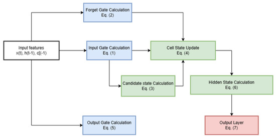 Assuming the current time step is , the input is being a musical representation (such as a one-hot encoded MIDI note or a vectorized musical feature that encapsulates note pitch, duration, and velocity), the previous hidden state is , and the previous cell state is . In LSTM, and represent the current time step’s hidden state and cell state, respectively.