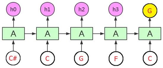 If we consider an individual neuron as A, the continuous action of LSTM in music generation is shown in Figure 3. After remembering the previous segment, when receiving the note C next, the output will be G. In short, the design of LSTM is to control and filter the flow of information in the cell state. By controlling the forget gate, input gate, and output gate, LSTM can capture long-term dependencies in sequence data and effectively handle the issues of vanishing or exploding gradients. This makes LSTM performwell in tasks that require long-term memory, such as language modeling, machine translation, speech recognition, and music generation.