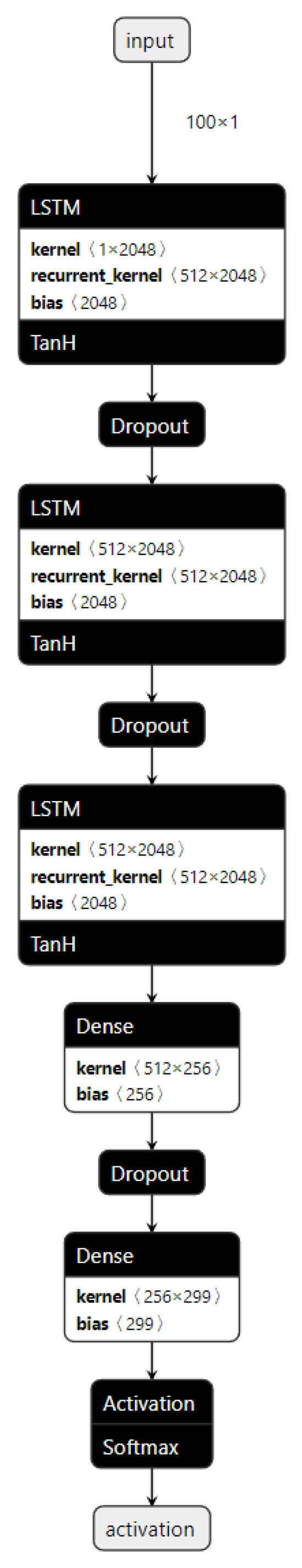 LSTM program architecture. The LSTM model comprises three LSTM layers, three Dense layers, and one Softmax activation layer.