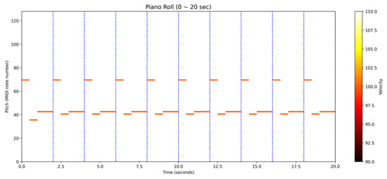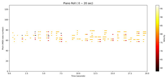 If we compare a piece of music (the original duration of the music is 2 min and 20 s), I capture 20 s of it for illustration. It can show the characteristics of the original music’s pitch and velocity. The Midi format diagram is shown in Figure 7. Then, we can get the characteristic diagram shown in Figure 8.