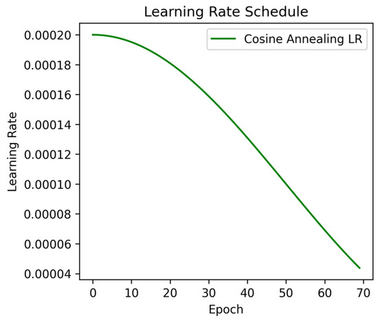 Learning rate changing diagram. Learning rate decay schedule during training, demonstrating a decreasing trend designed to avoid local optima and improve convergence stability, such as through cosine annealing or stepwise reduction.
