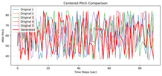 Learning pitch diagram. Comparison of pitch features between the first 90 s of 5 original songs in the same style and the music generated by the LSTM architecture.