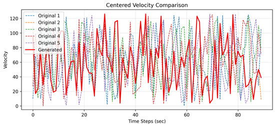Learning velocity diagram. Comparison of velocity features between the first 90 s of 5 original songs in the same style and the music generated by the LSTM architecture.