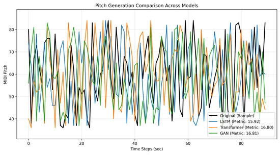 Pitch generation comparison across models. This plot evaluates the ability of LSTM, Transformer, and GAN to replicate real MIDI pitch patterns. The black line represents an original pitch sequence for reference. Key metrics include the “Average Distance to Original” (inset in labels), a measure of the mean absolute difference between generated and real pitches (lower values indicate higher fidelity to original patterns). The LSTM model (blue) shows tight alignment with the original sequence, highlighting its sequential coherence. The Transformer (orange) demonstrates smoother long-term trends, reflecting its effectiveness in capturing long-range dependencies. The GAN (green) exhibits slight deviations but greater variability, emphasizing its focus on generative diversity.