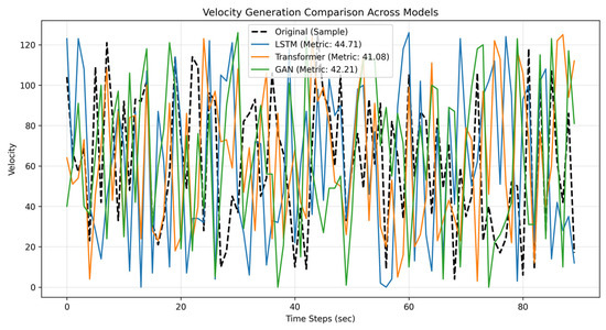 Velocity generation comparison across models. This plot assesses the models’ performance in reproducing MIDI velocity (dynamics) patterns. The black dashed line represents an original velocity sequence. The “Average Distance to Original“ metric (inset in labels) quantifies how closely generated velocities match real data, with lower values indicating better mimicry. The LSTM model (blue) closely follows the original’s dynamic fluctuations, showcasing its precision in temporal modeling. The Transformer (orange) maintains consistent alignment across the sequence, leveraging self-attention to handle long-term structural dependencies. The GAN (green) displays moderate deviation from the original but introduces more varied dynamics, illustrating its trade-off between fidelity and creative output.