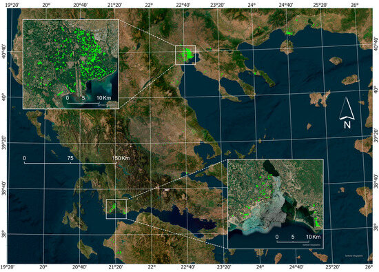 As a result, a total number of 1094 different parcels cultivated with nine different crops and covering an overall extent of 2667 hectares throughout mainland Greece were collected gradually over a period of ten consecutive years (2016–2025) (Figure 1).