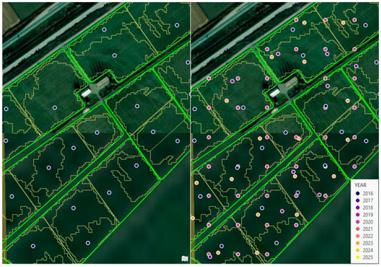 An indicative close view of the soil sampling schemes evolving over time (2016–2025); left side: targeted soil sampling of 2016 (the original within-parcel zone delineation is denoted by yellow polygons); right side: soil samples of all years; borders are in green.
