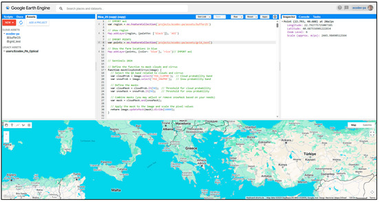 First is the downloading of image data from the Google Earth Engine platform with scripting. The user only has to import the point grid of 5 × 5 m and then define the area of interest and the time period in which the data are requested. The script contains the definitions of specific spectral indices derived from Sentinel-2 imagery; possible new indices have to be added in the script. The same script contains similar algorithms for downloading appropriate SAR modes from Sentinel-1 imagery.