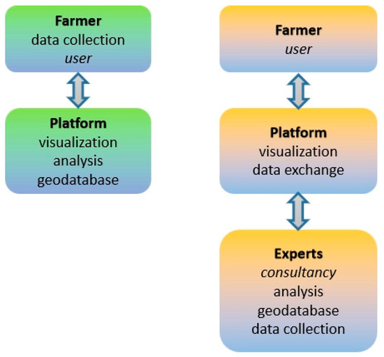 In different architectures, the geodatabase and the analytical tools may be found embedded on cloud-based platforms, while the farmer needs to contribute substantially to data collection without any consultancy from experts. This fact, though, may delay—or even undermine—the procedure of decision support. This approach can be called platform-based (Figure 7).