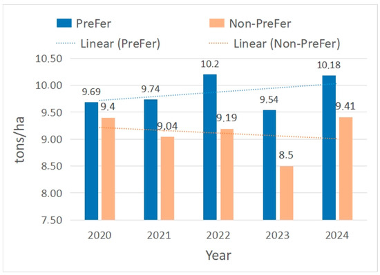 The rice yield data collected from the Axios river plain, Greece, in the period 2020–2024, indicating steadily significantly higher yield rates for the parcels where PreFer service was used (denoted as PreFer) compared to other parcels in the same area (denoted as Non-PreFer).