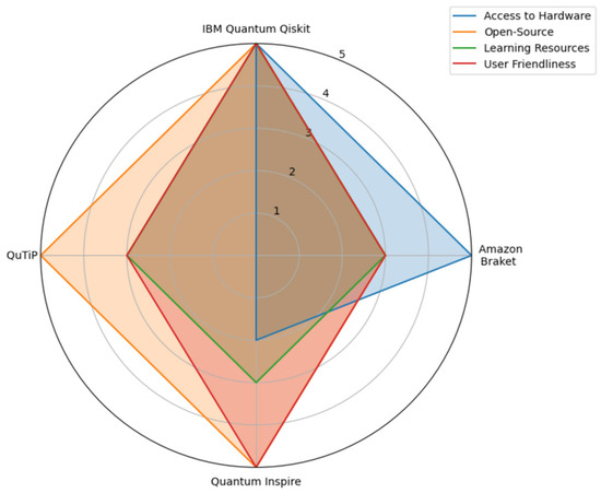 In summary, the strategic integration of quantum technologies in higher education requires more than technical readiness: it demands political commitment, curriculum design expertise, and sustained investment in educator preparation. As illustrated in Figure 8, the disparities between quantum education platforms reflect divergent approaches regarding accessibility, pedagogical orientation, and alignment with learning outcomes. This visual comparison clearly synthesizes each tool’s relative strengths and limitations based on key criteria such as hardware access, open-source availability, learning resources, and user-friendliness. reflect divergent approaches that, if not aligned with institutional priorities, may exacerbate existing educational inequalities.