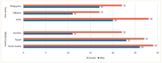 The gender-based comparison found no statistically significant differences in AI awareness, skills, efficacy, or application between male and female educators. The consistency in mean scores and non-significant p-values indicates equitable access to AI-related education and resources across genders. However, slight variations in ethical perspectives were noted, with female educators in the Middle East exhibiting stronger ethical considerations than their South Asian counterparts (p = 0.037). These differences suggest cultural influences may shape AI-related ethical viewpoints rather than technical competency disparities [2,3,4].