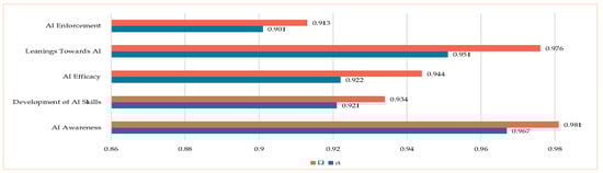 Consequently, the final version of the scale consisted of 40 items, distributed as follows: AI Awareness—8 items, Development of AI Skills—8 items, AI Efficacy—8 items, Leanings Towards AI—8 items, and AI Enforcement—8 items. Each item was carefully designed to assess educators’ preparedness to integrate AI into medical curricula, their ethical considerations, and their practical experiences with AI tools and methodologies relevant to medical teaching and research. To assess the reliability of the instrument, Cronbach’s Alpha (α) and McDonald’s Omega (Ω) coefficients were calculated, confirming high internal consistency across all five factors (See Figure 2). This rigorous validation ensured that the research instrument effectively captured AI competency and readiness among medical educators, contributing valuable insights into the evolving landscape of AI integration in medical education.