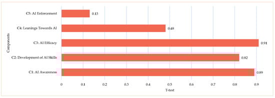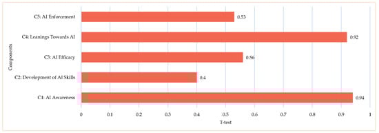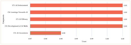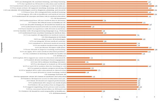 - For each AI competency component (C1 to C5), a composite mean score was calculated by averaging participants’ responses across all items within the corresponding component;