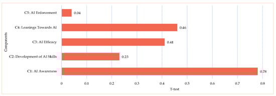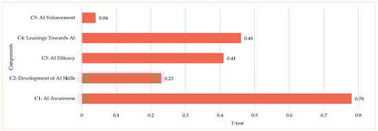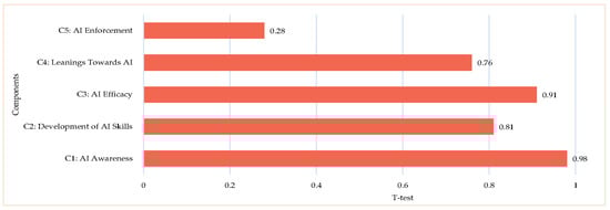 Overall, a statistically significant difference was observed in Component C5: AI Enforcement (p = 0.04), reflecting distinct regional perspectives on the ethical implementation of AI. Thus, while Components C1–C4 did not show significant differences (p > 0.05), the notable divergence in ethical orientation supports RH2 and leads to the rejection of H02, indicating that the regional context influences how AI is perceived and adopted.
