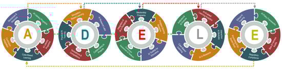 Empirical ADELE data-driven technique. Explanation of the Arrows: Orange Arrows: Represent transitions focused on curriculum and instructional development, particularly from Awareness to Development; Teal Arrows: Depict pathways for research and collaborative integration, guiding progress from Development to Efficacy and beyond; Red Arrows: Highlight advanced AI engagement and mentorship processes, reflecting deeper implementation from Efficacy to Learning; Grey Arrows: Indicate institutional and policy-level progression toward Enforcement, ensuring scalability and compliance; Yellow Arrows: Complete the cycle by reinforcing feedback loops from Enforcement back to Awareness, thereby fostering continuous improvement and sustainability.