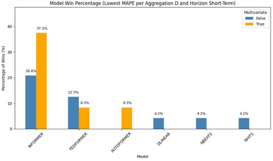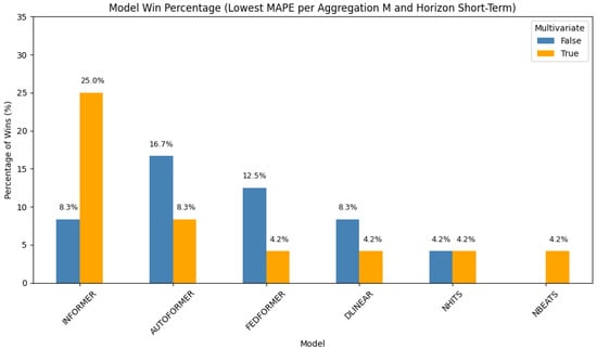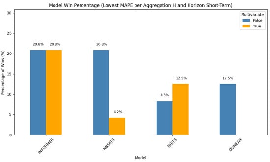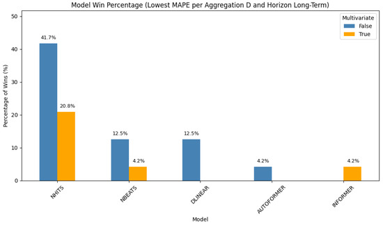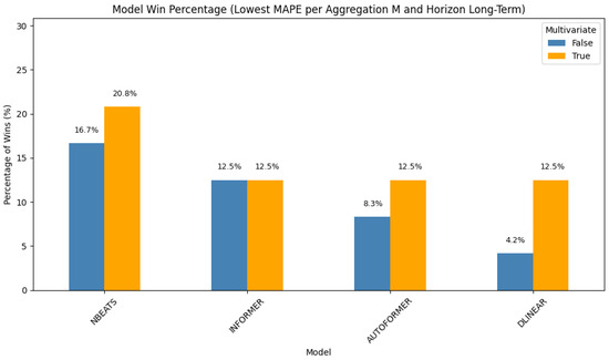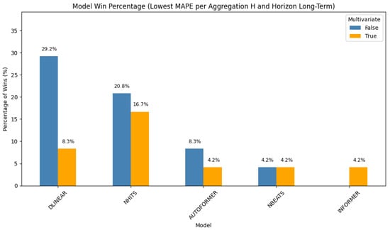 In this setting (Figure 1), the Informer model leads with a 41.6% win rate. Its performance is equally split between the univariate and multivariate configurations (each at 20.8%). NBEATS follows, with 20.8% of wins attributed to its univariate form and an additional 4.2% to its multivariate variant. NHITS and DLinear round out the top-performing models in this scenario. These results demonstrate the strength of transformer-based architectures in short-term, high-resolution forecasting, particularly when temporal dependencies dominate.