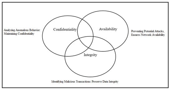 Anomaly detection in blockchain systems plays a vital role in upholding the core principles of the confidentiality, integrity, and availability (CIA) triad. By identifying malicious transactions, it helps preserve data integrity; by preventing potential attacks, it ensures the continued availability of the network and through analyzing suspicious behavior, it contributes to maintaining confidentiality. This integration of ML into blockchain security highlights how advanced technologies can effectively translate foundational cybersecurity principles into practical safeguards within decentralized systems [4,5]. Figure 1 shows the CIA-Triad.