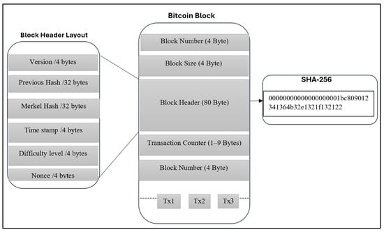 Figure 2 illustrates the layout of a Bitcoin block. A block header is 80 bytes, including the version, previous hash, Merkle hash, timestamp, difficulty level, and nonce value. The block information is then hashed so that it forms a link to the inside of the next block’s header. These blocks are chained using hashing [10].