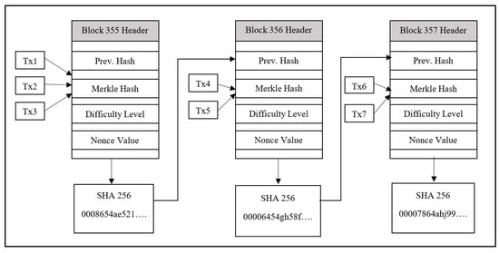 Figure 3 illustrates the structure of some interconnected Bitcoin blocks. In a Merkle tree process, Tx1, Tx2, and Tx3 are hashed, and then a nonce value is added sequentially along with the difficulty level to create another hash. This entire data string adds a hash value in the following block to form a chain.