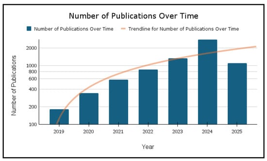 Figure 5 shows the publication trends from 2019 to 2025. The x-axis represents sequential years, while the y-axis on the right quantifies the number of publications, ranging from 100 to 2000. The bar chart indicates the specific publication count for each year, while the superimposed line graph traces the cumulative number of publications over this period. The data reveal a consistent upward trajectory in publication numbers until 2024, with a particular increase between 2019 and 2024. This trend appears to decline slightly in 2025, suggesting a potential stabilization in the publication output during this period.