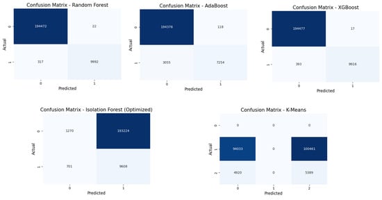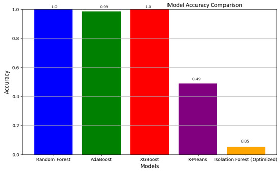 It is useful to recall that researchers use such factors as precision, recall, and F-score to compare the outcome of an anomaly detection model. Table 5 demonstrates the performance matrix of the implemented ML models. The performance matrix shows that Random Forest and XGBoost are efficient models with maximum accuracy of 99.83% and 99.80%, with a good value of precision, recall, and F1 score, which shows that the models can be very effective for the detection of anomalies. The performance of AdaBoost is also quite impressive, with an accuracy of 98.45%. However, it is slightly lower at the recall of 70.37%, meaning that although it yields accurate results with good precision, it does not detect all the anomalies. Additionally, the performance of the K-Means algorithm is relatively lower compared with other models, with a maximum accuracy of 48.54% at the best level. Despite the precision ratio being impressively high at 95%, the model struggles with recall, and the significant number of outliers cannot be detected. However, it labels outliers with high probability and with elevated certainty. The Isolation Forest algorithm shows a poor performance even after the optimization across all metrics, which indicates that it is the least effective model for anomaly detection in the blockchain.