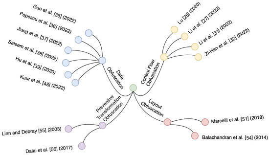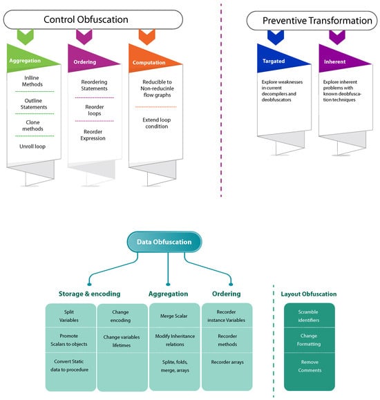 Software obfuscation is the first type concerned with obsecuring the data, control, and layout of the software’s genuine implementation and providing a semantically similar but novel performance [23]. There is no popular official definition for code obfuscation. It is a conversion procedure to change one code into another with the same features as the old code [24]. It can also be handled as an executable that includes encrypted parts and a simple code part to decrypt the encrypted code part [5]. Software obfuscation is grouped into four kinds [25] depending on the objective of obfuscation, as indicated in Figure 2.